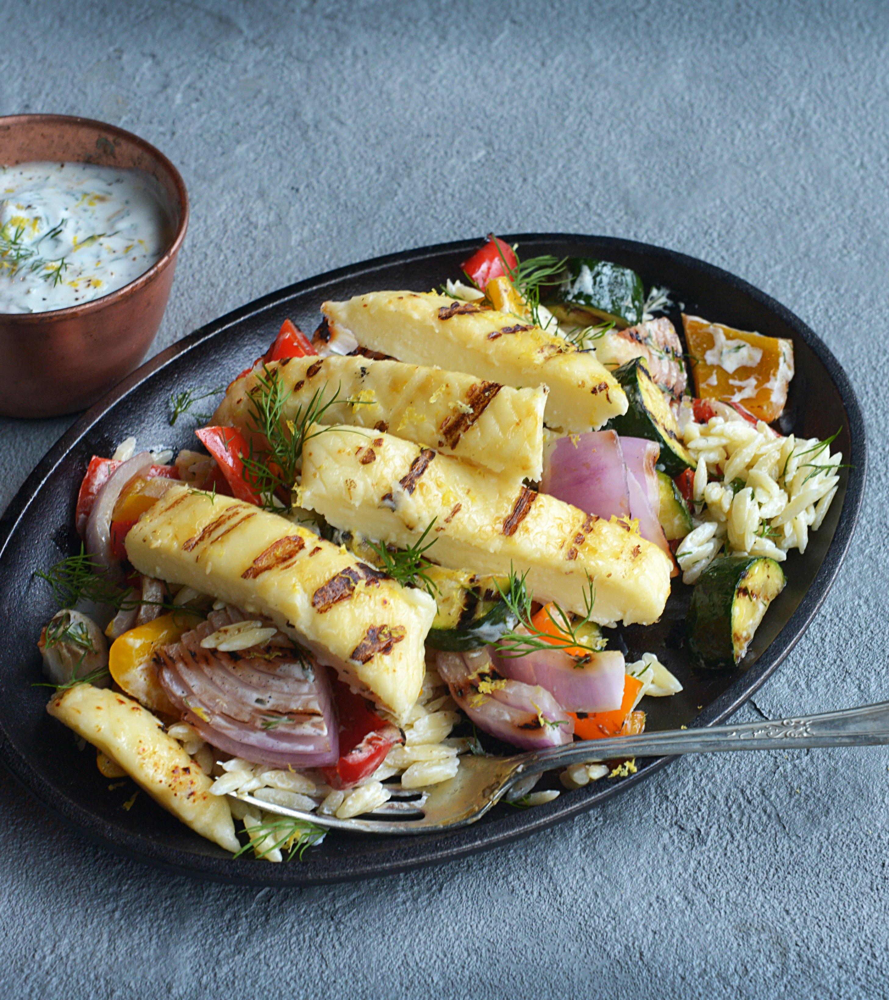 Salade d'orzo, légumes et fromage grillé avec vinaigrette crémeuse à l’aneth