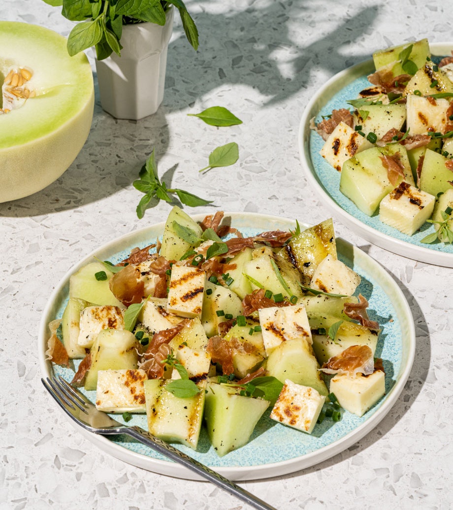 On peut remplacer le melon miel par un cantaloup, si désiré. Des tranches de pain au levain grillées au barbecue et beurrées accompagnent délicieusement ce plat et elles permettent d’éponger la vinaigrette.