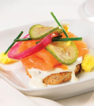 Sandwich ouvert scandinave au saumon fumé, crémeux au brie d’ici, concombres et oignons marinés, œuf cuit dur