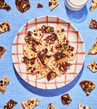 Caramel croquant aux deux chocolats, aux canneberges et aux pistaches