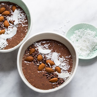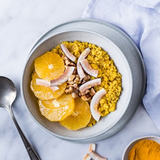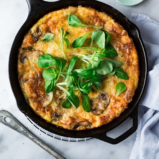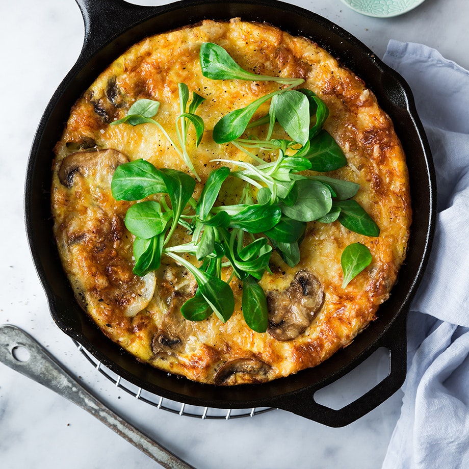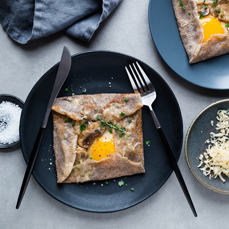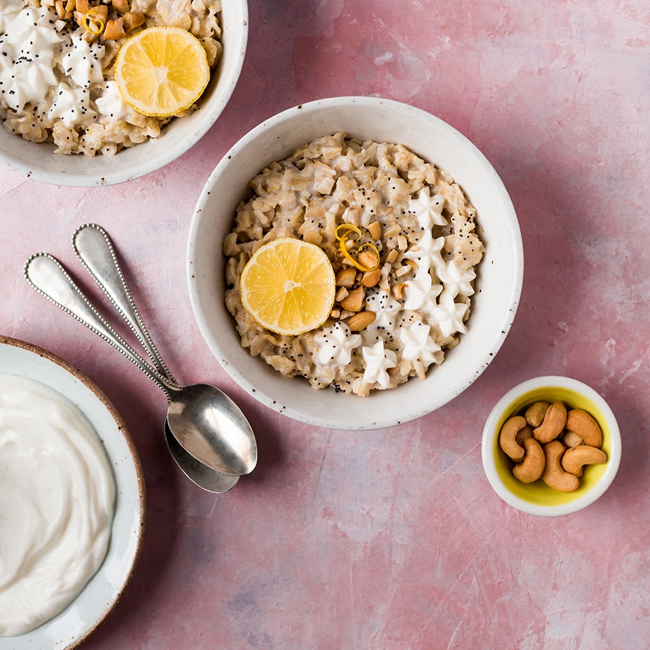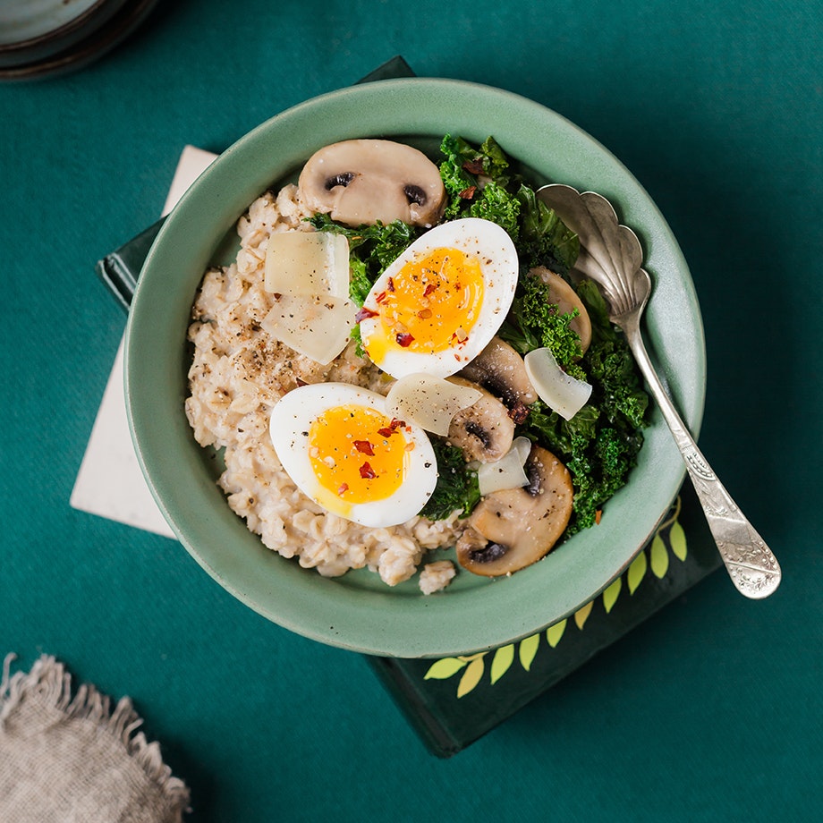 Gruau salé d’avoine, œuf mollet, sauté de chou frisé et champignons