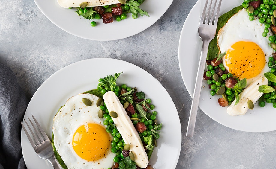 Crêpes à l’avocat, poêlée de petits pois et pancetta