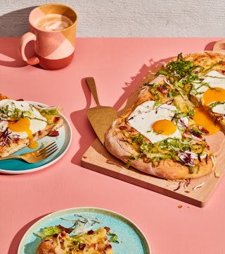 La pizza non cuite peut être assemblée 8 heures avant sa cuisson, sans les œufs ni la salade, et conservée au réfrigérateur. Il suffit d’ajouter les œufs juste avant de l’enfourner, puis de la garnir de salade au moment de servir.