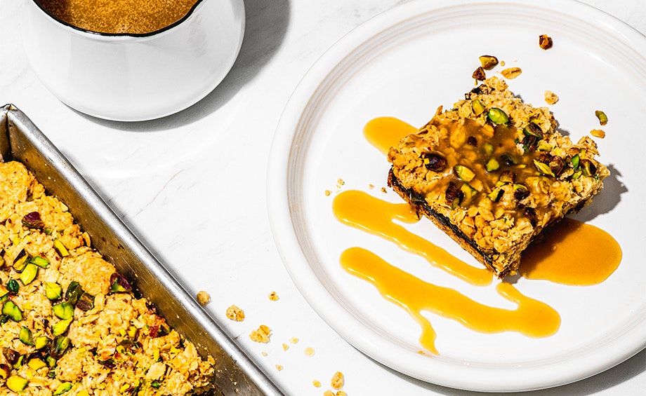 Carrés aux dattes aux pistaches avec sauce à l’érable