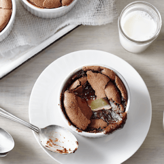 Petite soupe de poire au Rassembleu, chocolat blanc et banane caramélisée