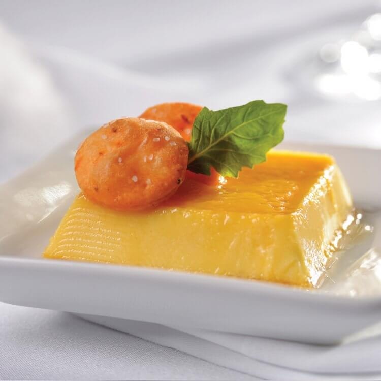 Crème caramel au fromage Magie de Madawaska et au whisky, craquelins à la fleur de sel
