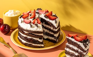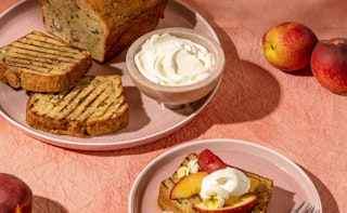 Pain aux zucchinis grillé, avec pêches macérées et crème fraîche