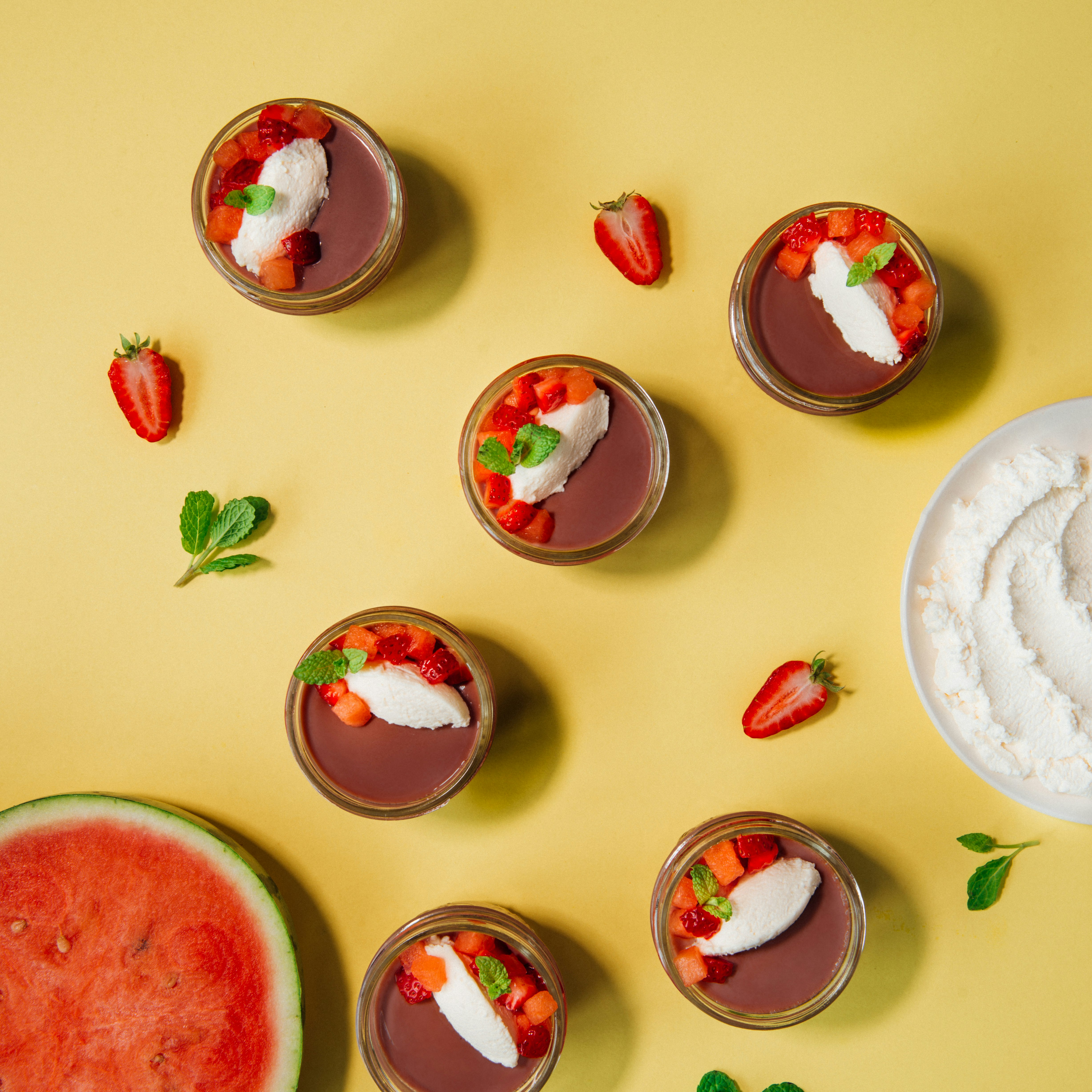 Panna cotta au lait au chocolat, fraise et melon d’eau