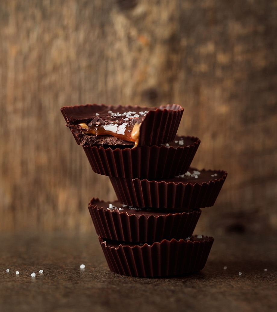Bouchées au chocolat, caramel salé et beurre de noix