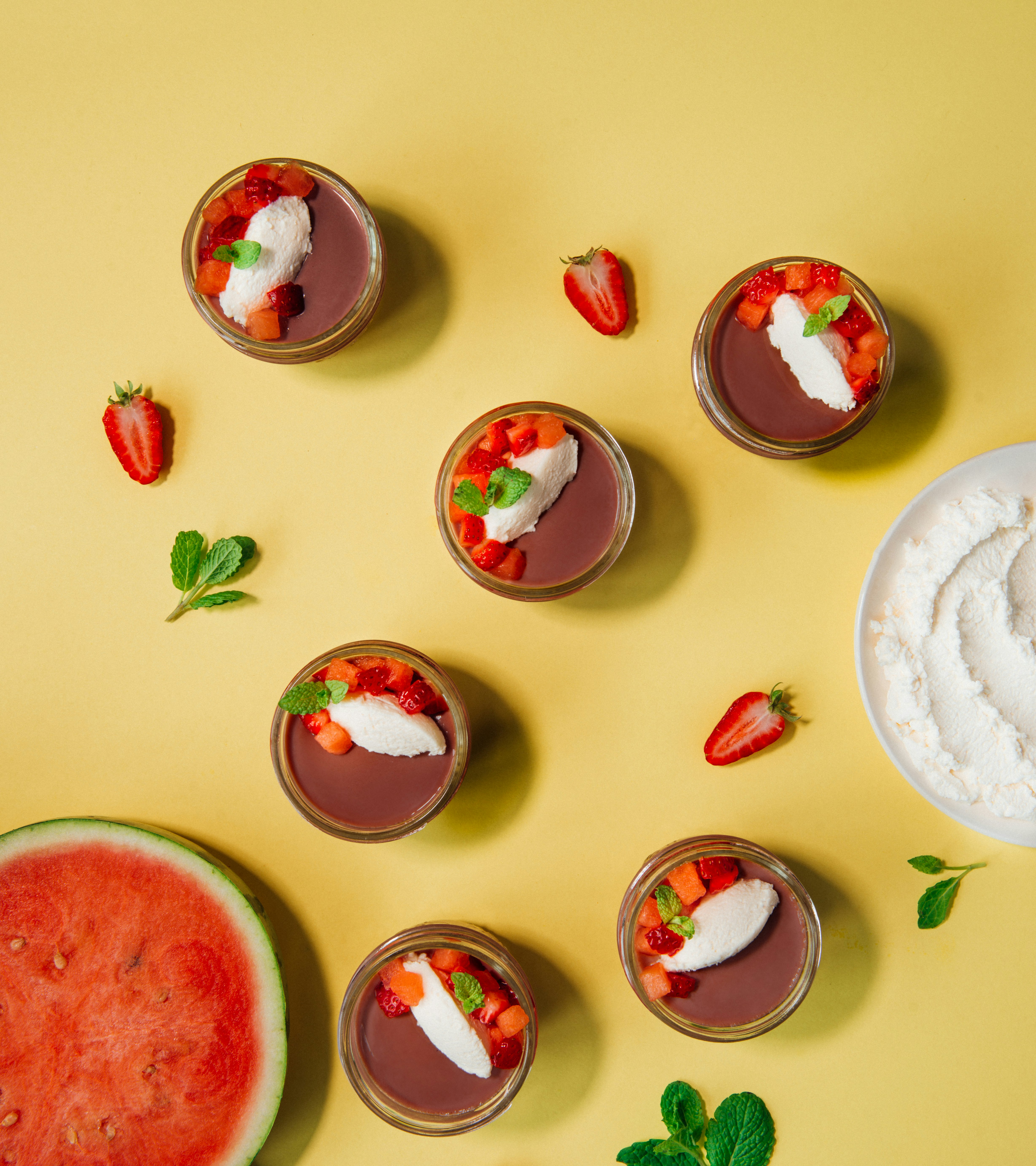 Panna cotta au lait au chocolat, fraise et melon d’eau