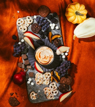 Pour faire un plateau-dessert d’Halloween comme celle de la photo, accompagner les bretzels et la trempette des éléments suivants, au choix : quartiers de pomme et/ou de prune, raisins noirs en petites grappes, biscuits au chocolat et guimauves miniatures.