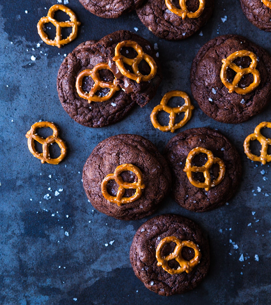 - Congeler les boules de pâte crues sur une plaque à pâtisserie à la fin de l’étape 6, avant de transférer dans un sac hermétique refermable. Laisser décongeler 10 minutes sur une plaque à pâtisserie recouvert de papier parchemin, placer un mini bretzel sur chaque biscuit en appuyant légèrement, avant de les cuire au four. Saupoudrer d’un peu de fleur de sel. Ajouter 2 à 3 minutes au temps de cuisson.