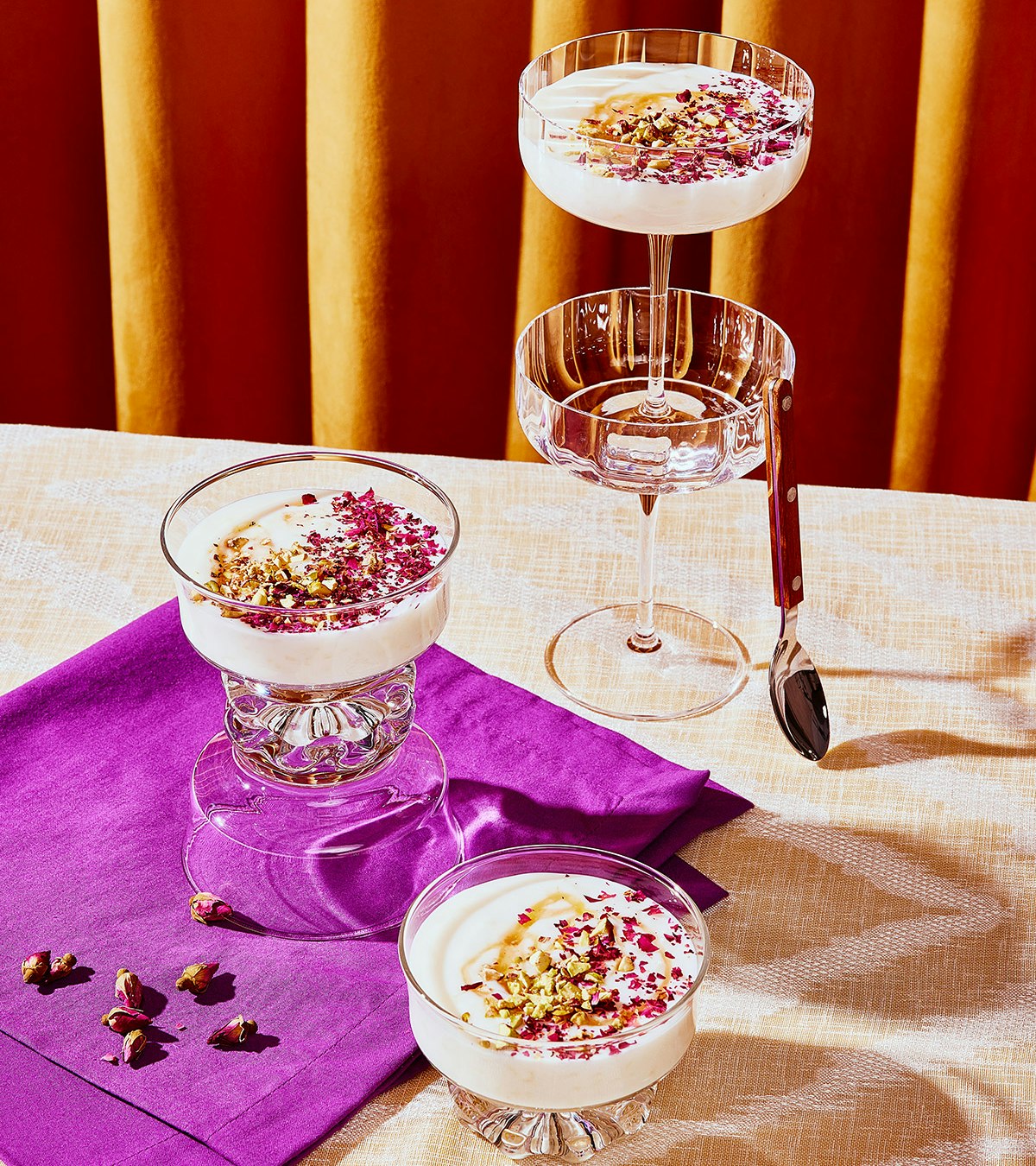 Plutôt que de mettre le riz au lait dans un bol avant de le réfrigérer, il est possible de le répartir aussitôt dans les quatre coupes et de réfrigérer celles-ci sans les couvrir. Pendant la réfrigération, une mince croûte ondulée se formera à la surface. C’est habituellement ainsi que l’on sert ce dessert au Moyen-Orient. (Ajouter les garnitures au moment de servir.)