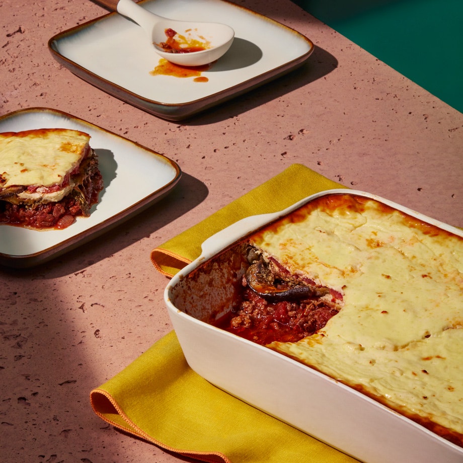 Gratin d'agneau aux tomates, aubergines, oignons et fromage feta (comme une moussaka)