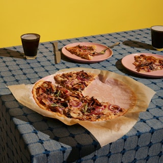 Pizza bianca aux trois fromages, aux champignons et à la pancetta
