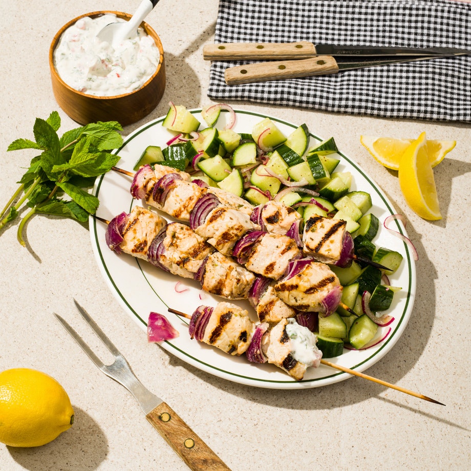 Brochettes de poulet mariné et raïta à la menthe