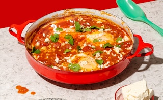 Oeufs poêlés aux poivrons, tomates, oignons et fromage (style chakchouka)