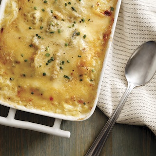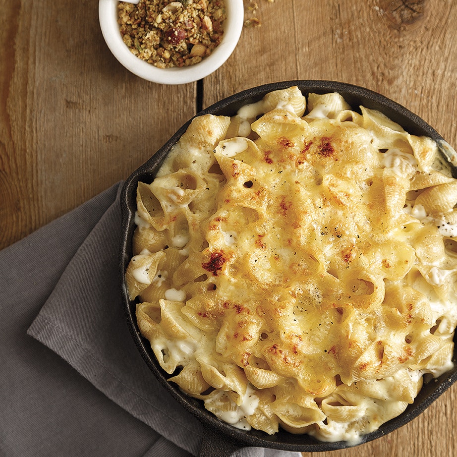 Coquilles au fromage, sauce crémeuse au chou-fleur et crumble de noix