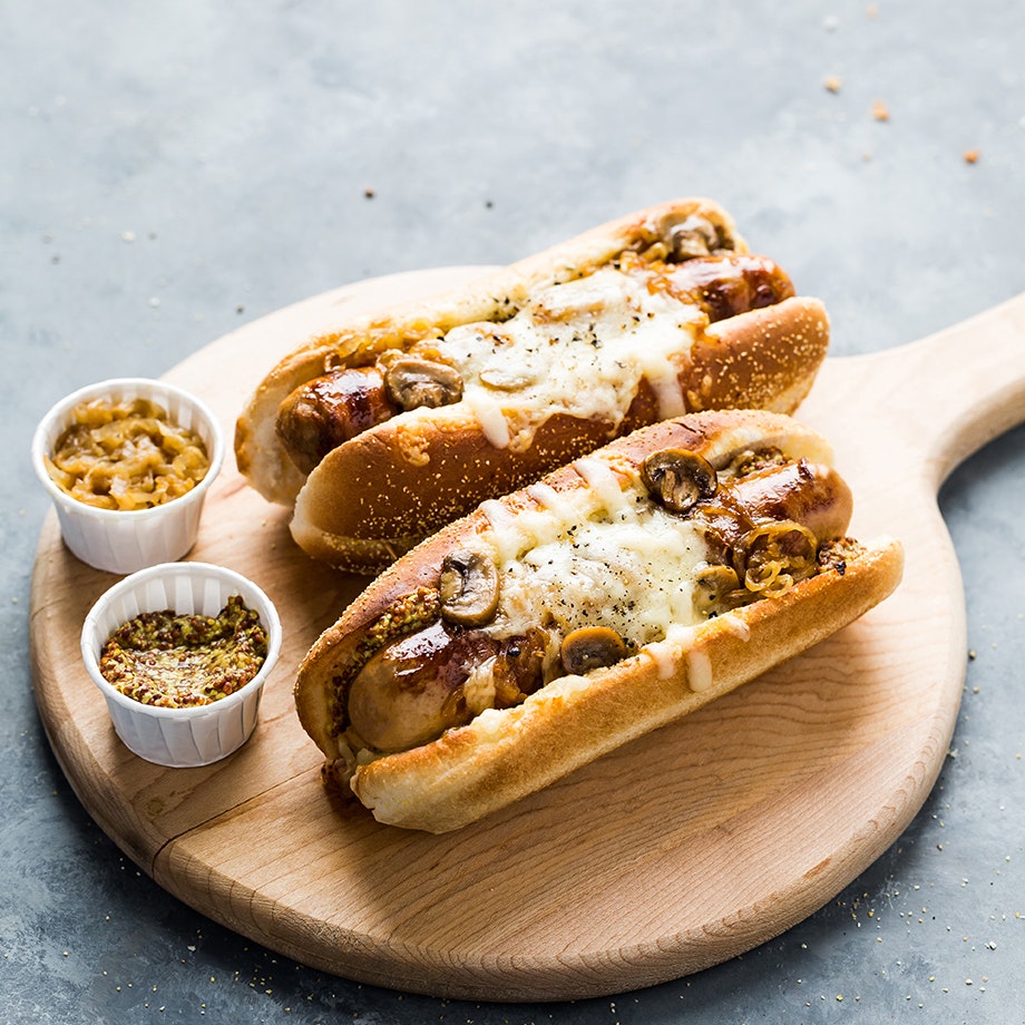 Hot-dogs aux oignons caramélisés, champignons et fromage
