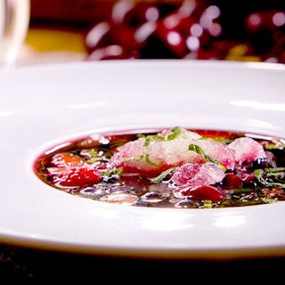 Soupe de petits fruits au vin rouge, panna cotta et granité de miel