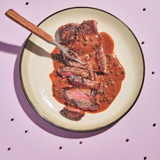 Tataki de bison, mousseline de champignons, vinaigrette au fenouil et maïs mariné