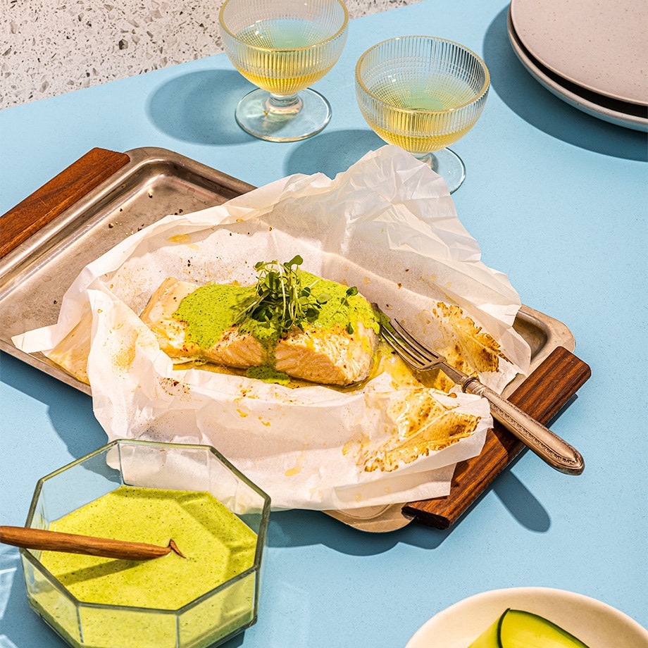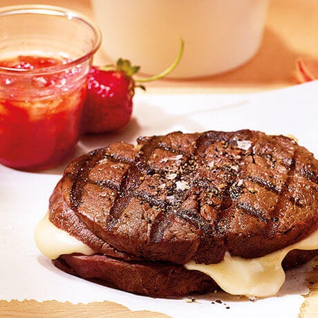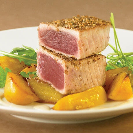 Longe de marcassin, radis, purée de pêches et beurre au basilic