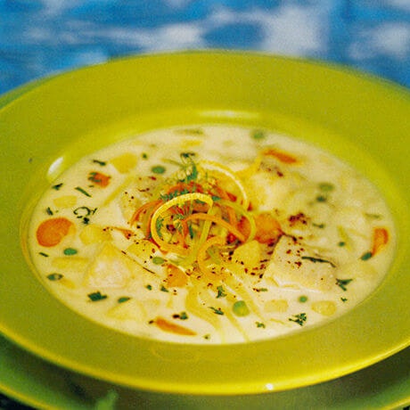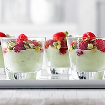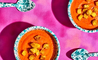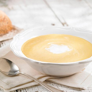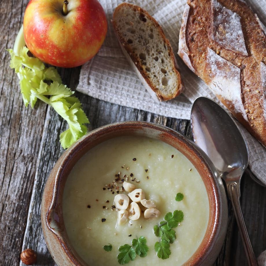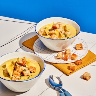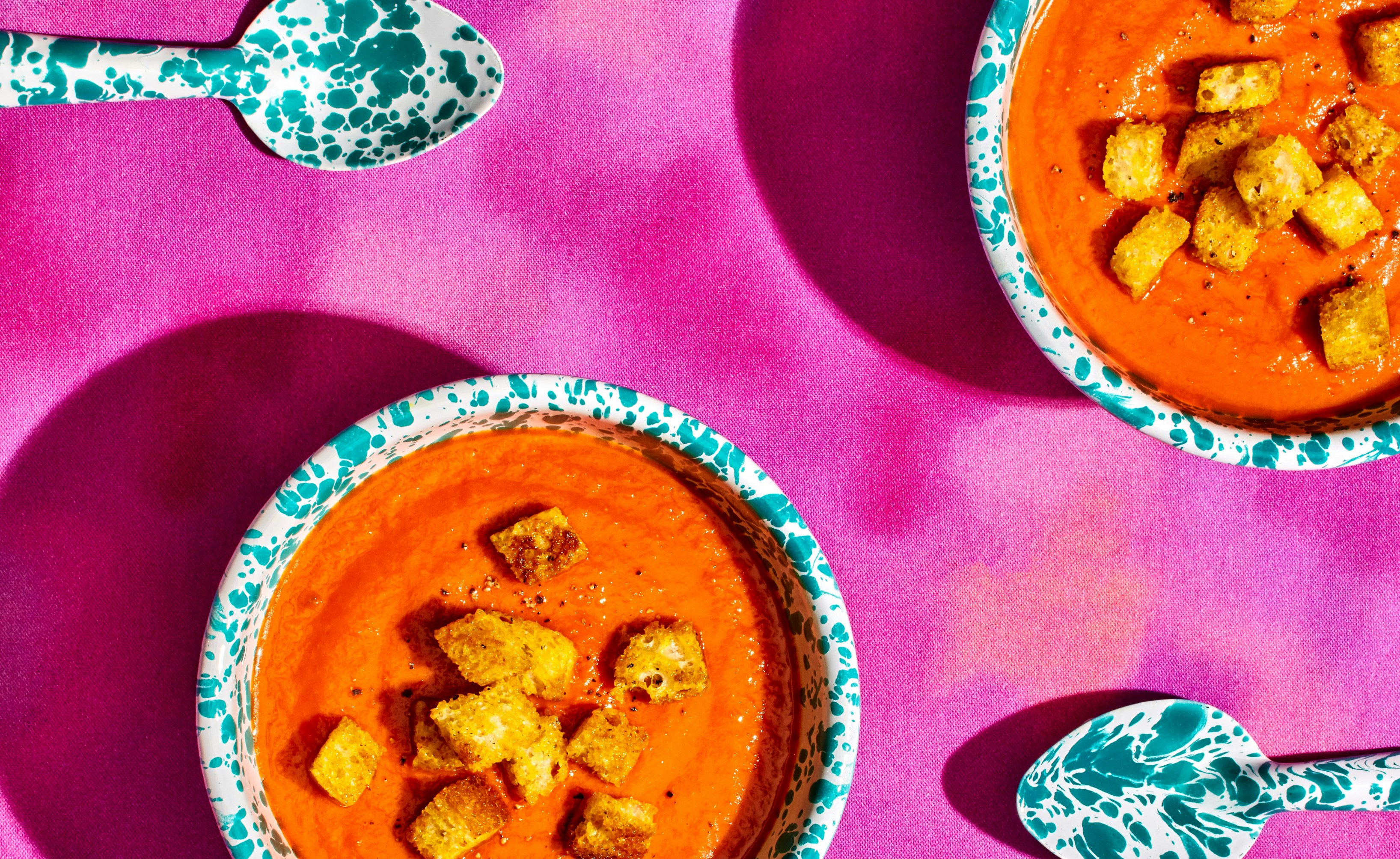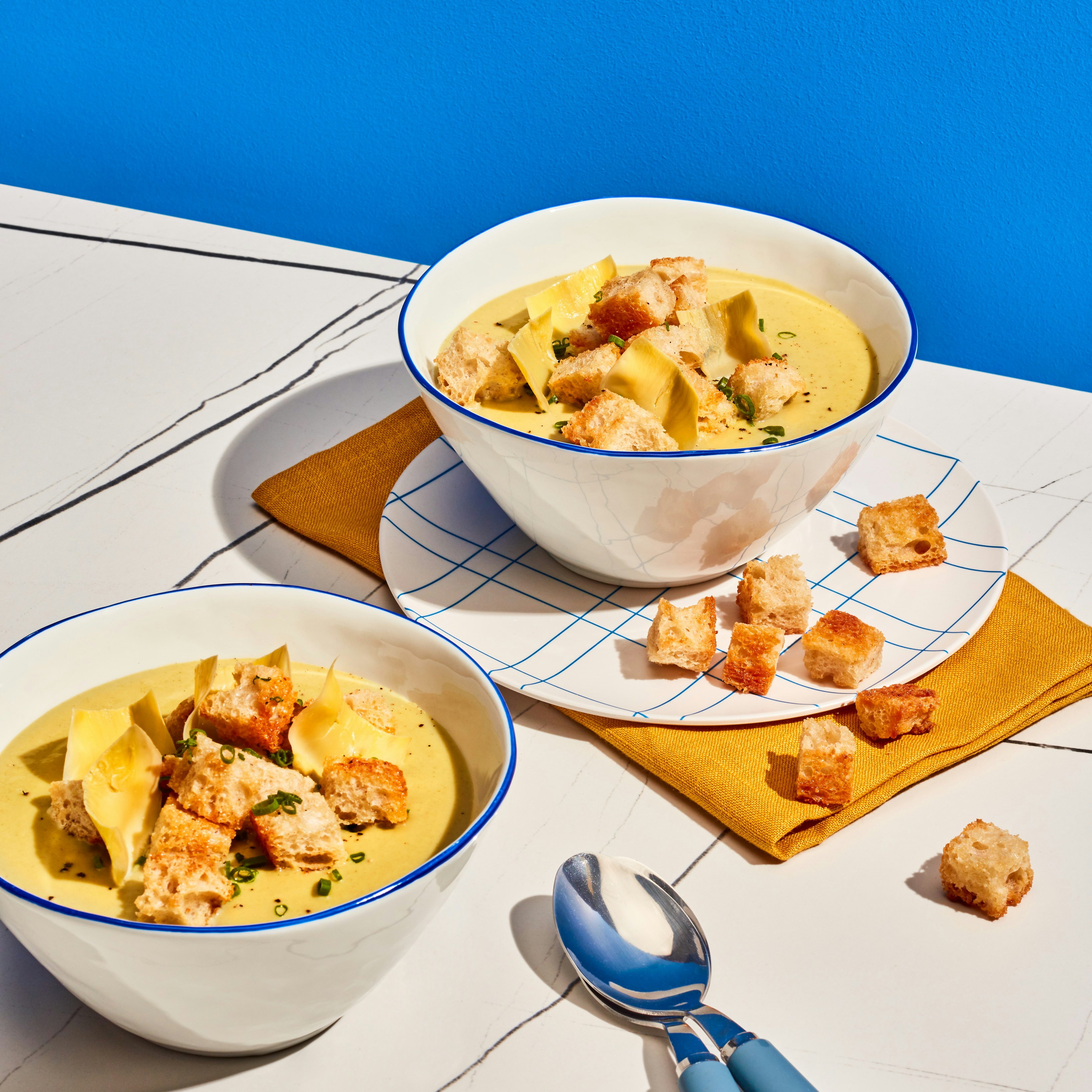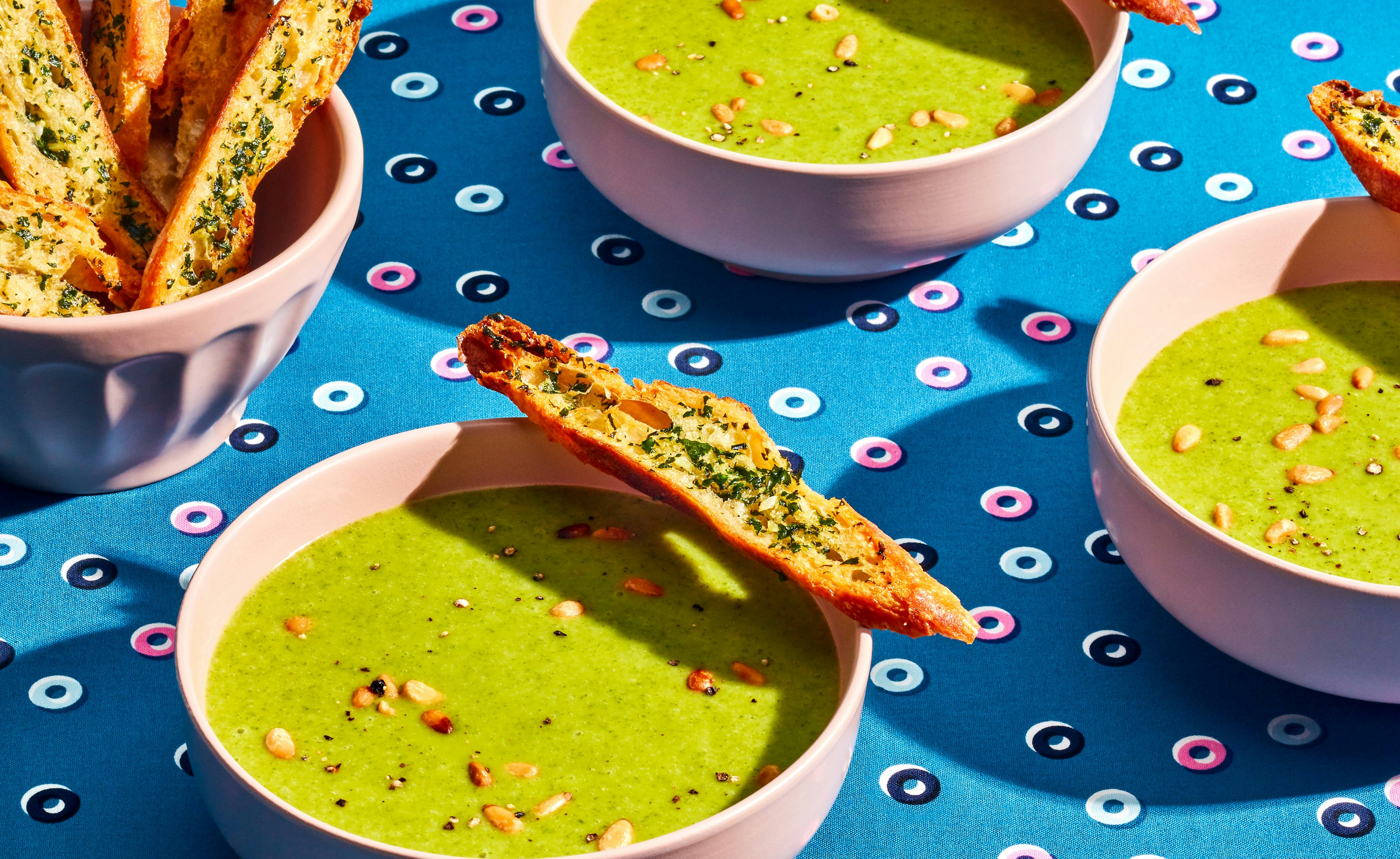 Crème de roquette, noix de pin grillées et croûtons à l’ail