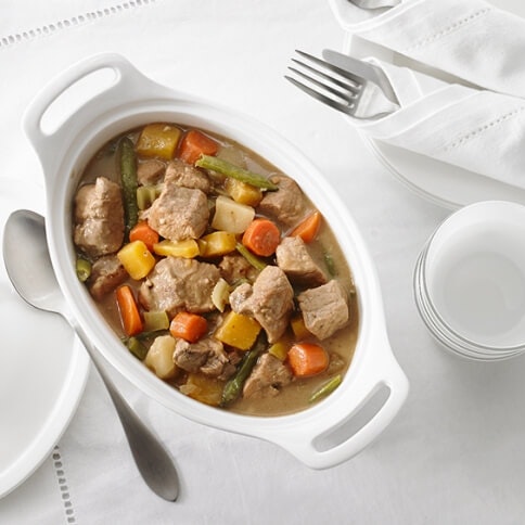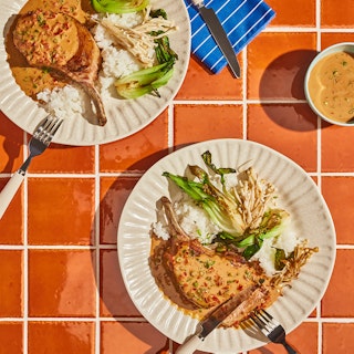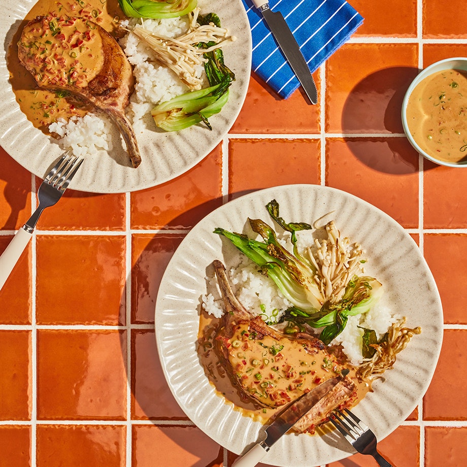 Côtelettes de porc, sauce au caramel, aux oignons verts et aux poivrons