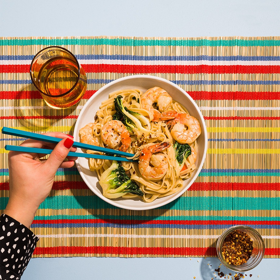 Nouilles de riz aux crevettes, sauce crémeuse au gingembre