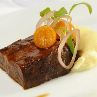 Paleron de bœuf braisé, aligot de panais et au fromage La Belle-Mère, cerises de terre et jus de veau