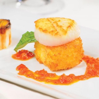Palet de risotto croustillant au cidre et Le 1608, pétoncles et poireaux juste grillés, sauce au pesto de tomates séchées et câpres
