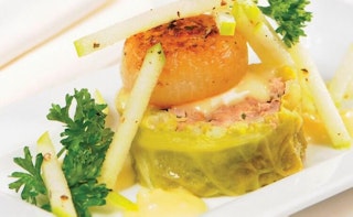 Cigares au chou de porc, sauce au fromage Le Jersey, oignons cippollini braisés