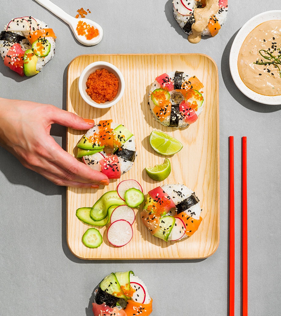Pour aider les garnitures à coller au riz, utiliser un peu du mélange de labneh restant.