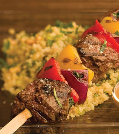 Brochettes de bœuf et de légumes, sauce crème au raifort
