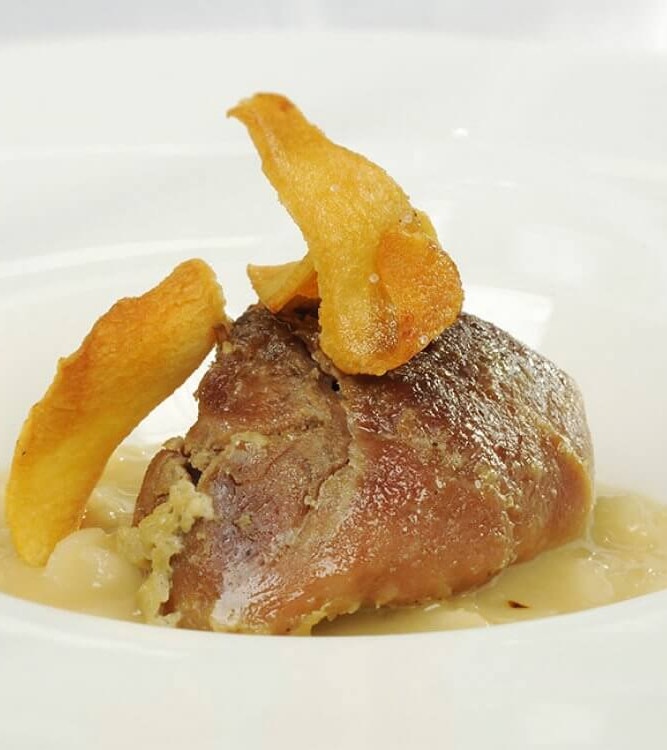 Épaule de porc braisée au lait sur risotto aux topinambours et au fromage Les Métayères