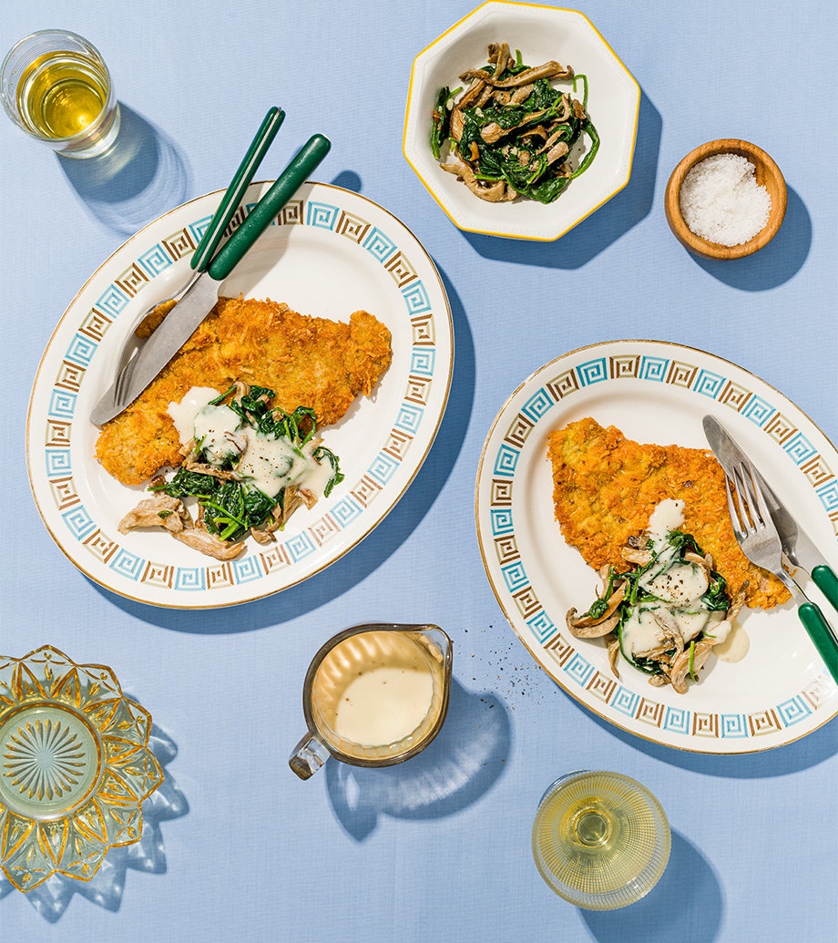 Escalopes de veau au parmesan, poêlée de champignons aux épinards et à la crème