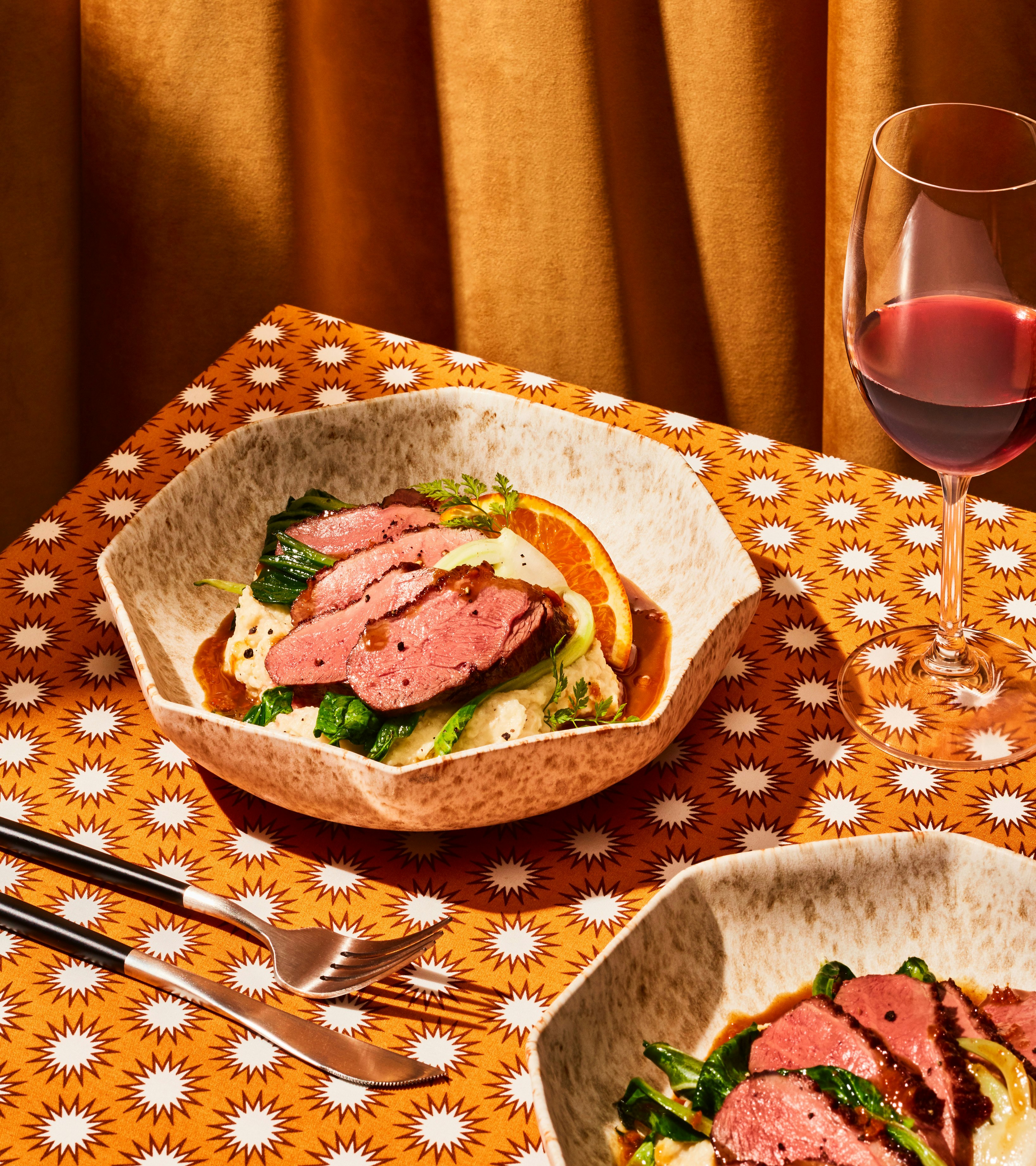 Magrets de canard, purée de céleri-rave et sauce à l'orange