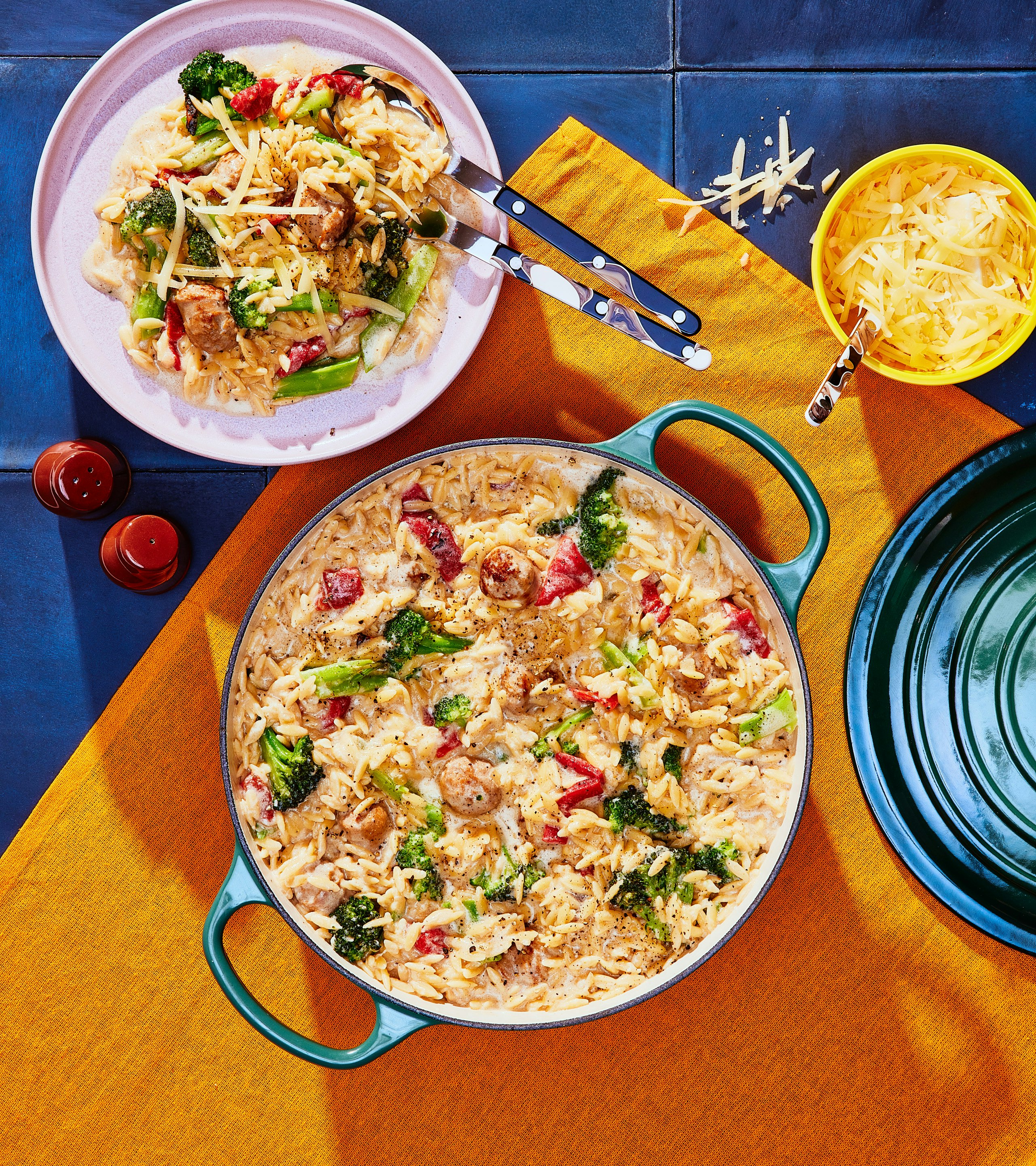 Orzo à la saucisse, aux mini-brocolis et au Cheddar one pot