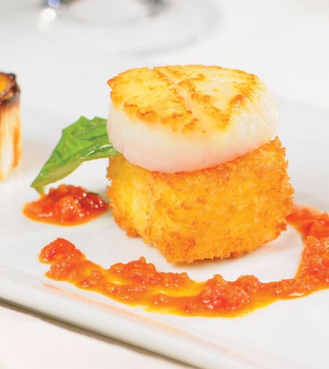Palet de risotto croustillant au cidre et Le 1608, pétoncles et poireaux juste grillés, sauce au pesto de tomates séchées et câpres
