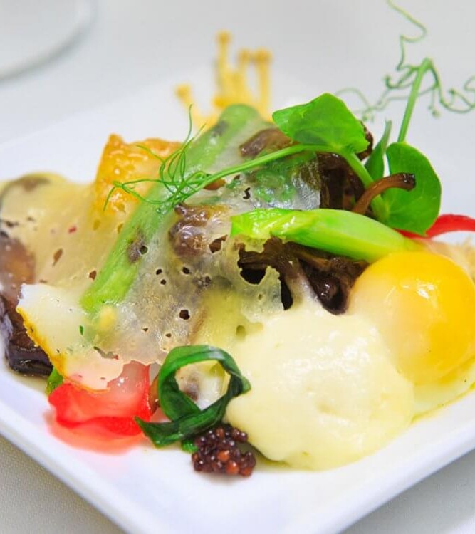 Poêlée de champignons, mousse de fromage Le Monnoir, œuf 63 degrés