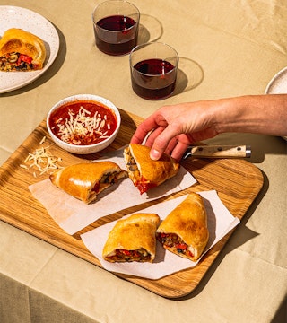 Vous pouvez servir les calzones avec une sauce marinara et du fromage parmesan d’ici, râpé.