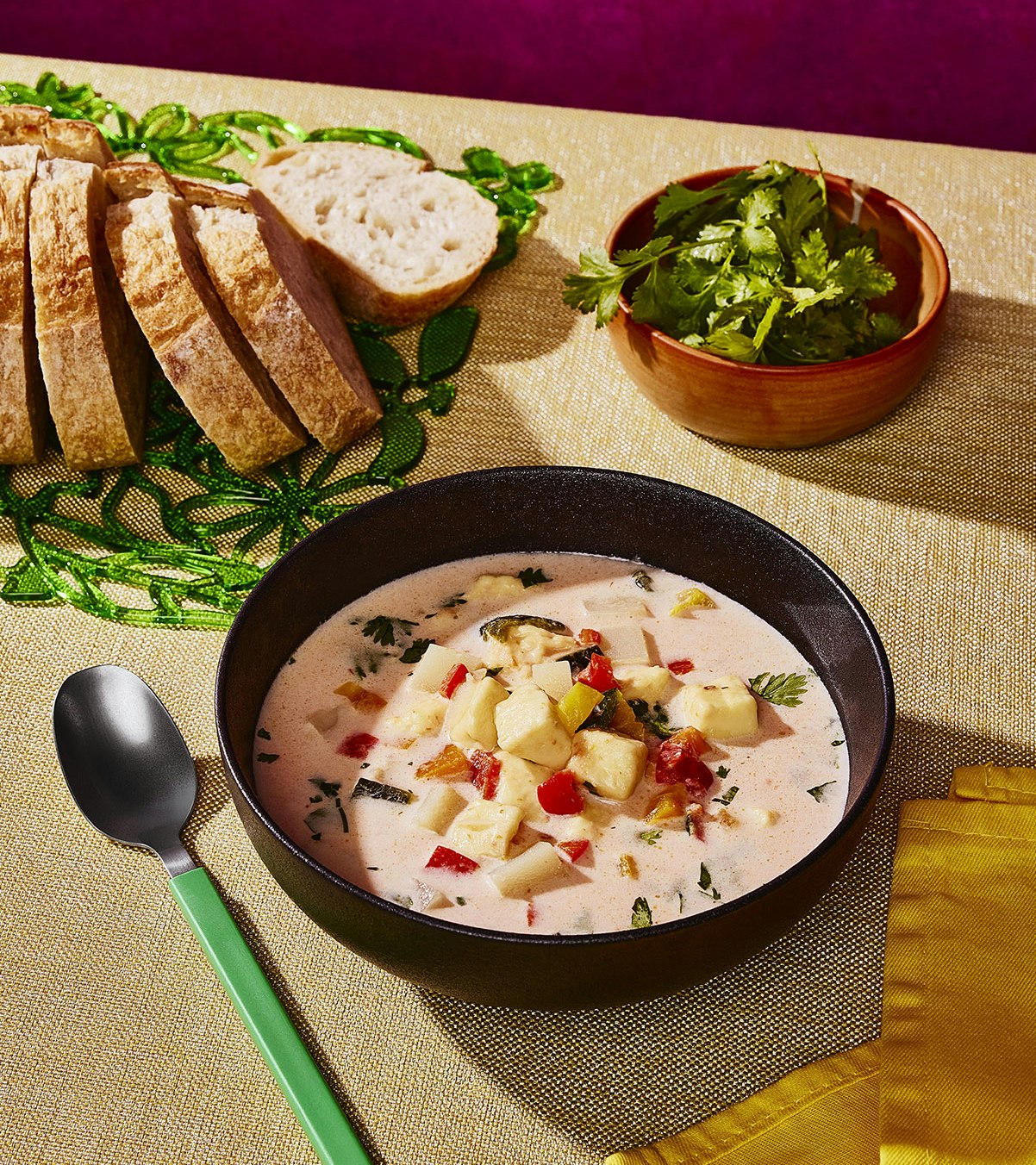Le Sonora, un État du nord-ouest du Mexique, est la région d’origine de cette soupe dont le nom espagnol est caldo de queso. Le panela est un fromage frais typique du Mexique qui fond peu quand il est chauffé. Il se trouve habituellement dans les épiceries latino-américaines et dans certaines épiceries non spécialisées. Pour réaliser cette recette, on peut remplacer le panela par du panir ou du halloumi. (Le panir est généralement moins salé que le panela, tandis que le halloumi est plus salé. Ajuster en conséquence la quantité de sel dans la chaudrée.) Le feta peut aussi servir de substitut, mais ce fromage fondra davantage. Accompagnement suggéré : pain croûté.