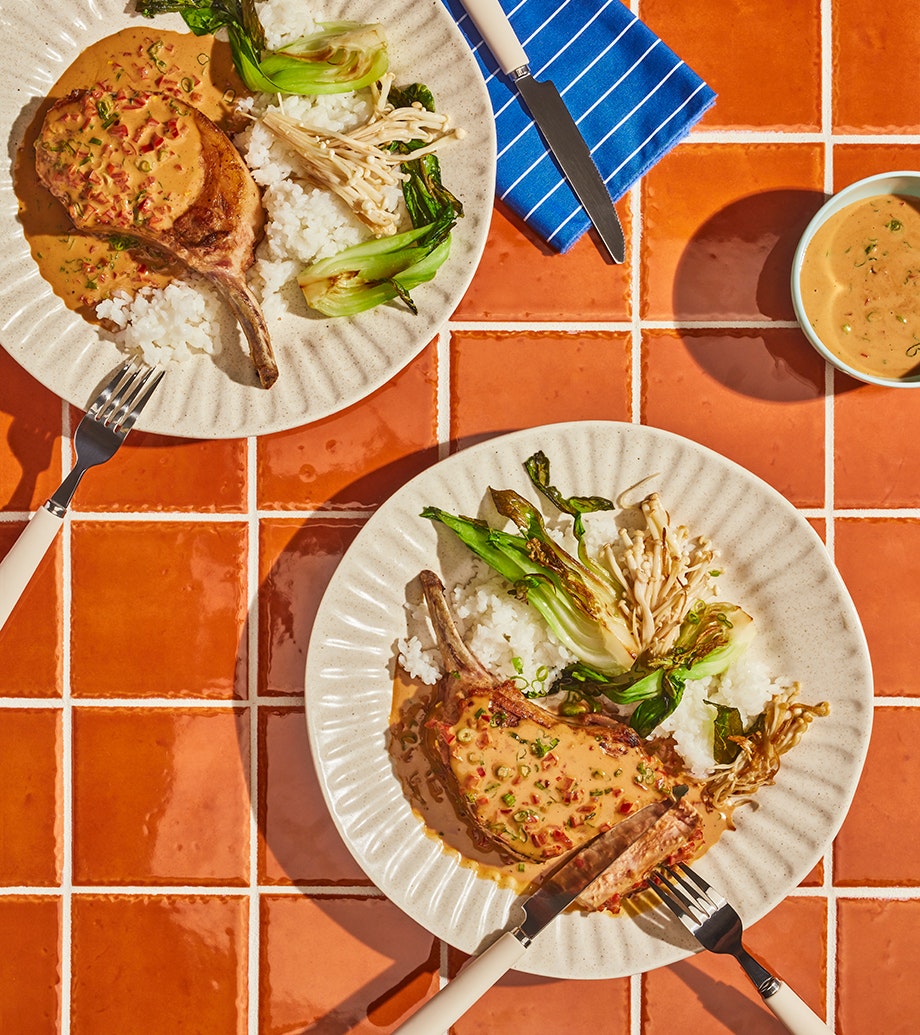 Côtelettes de porc, sauce au caramel, aux oignons verts et aux poivrons