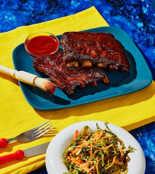 On peut terminer la cuisson des côtes levées au barbecue plutôt qu’au four. Huiler la grille et préchauffer le barbecue à puissance élevée pendant 10 minutes. Faire cuire les côtes levées de la même façon qu’à l’avant-dernière étape de la préparation ci-dessus.