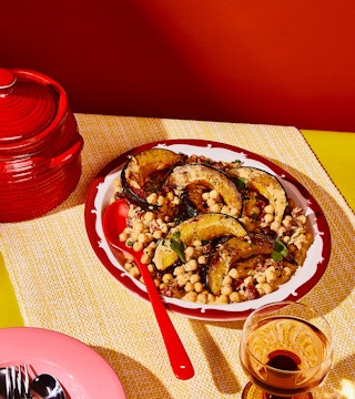 Découvrez des courges rôties, caramélisées, sur un lit de pois chiches. Une recette sans gluten avec une option végétarienne, parfaite pour un dîner.