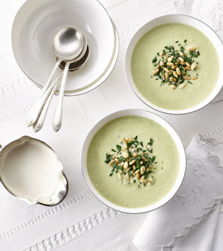 Crème de romanesco aux noix de pin et à l’ail