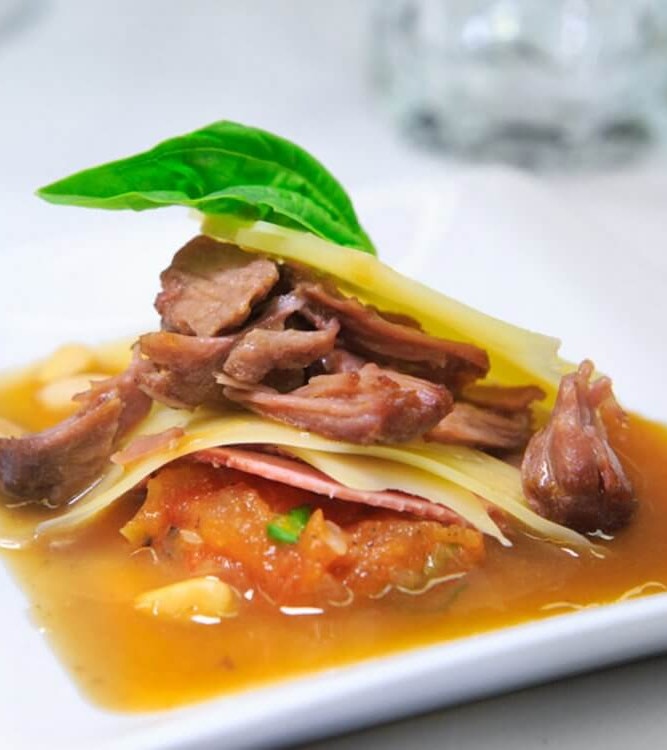 Effiloché de veau et langue braisée, fromage Le Canotier de l’Isle, compote à la tomate grillée, basilic