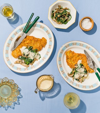 Escalopes de veau au parmesan, poêlée de champignons aux épinards et à la crème