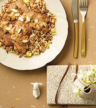 Escalopes de veau rapido, sauce cari, raisins secs et amandes