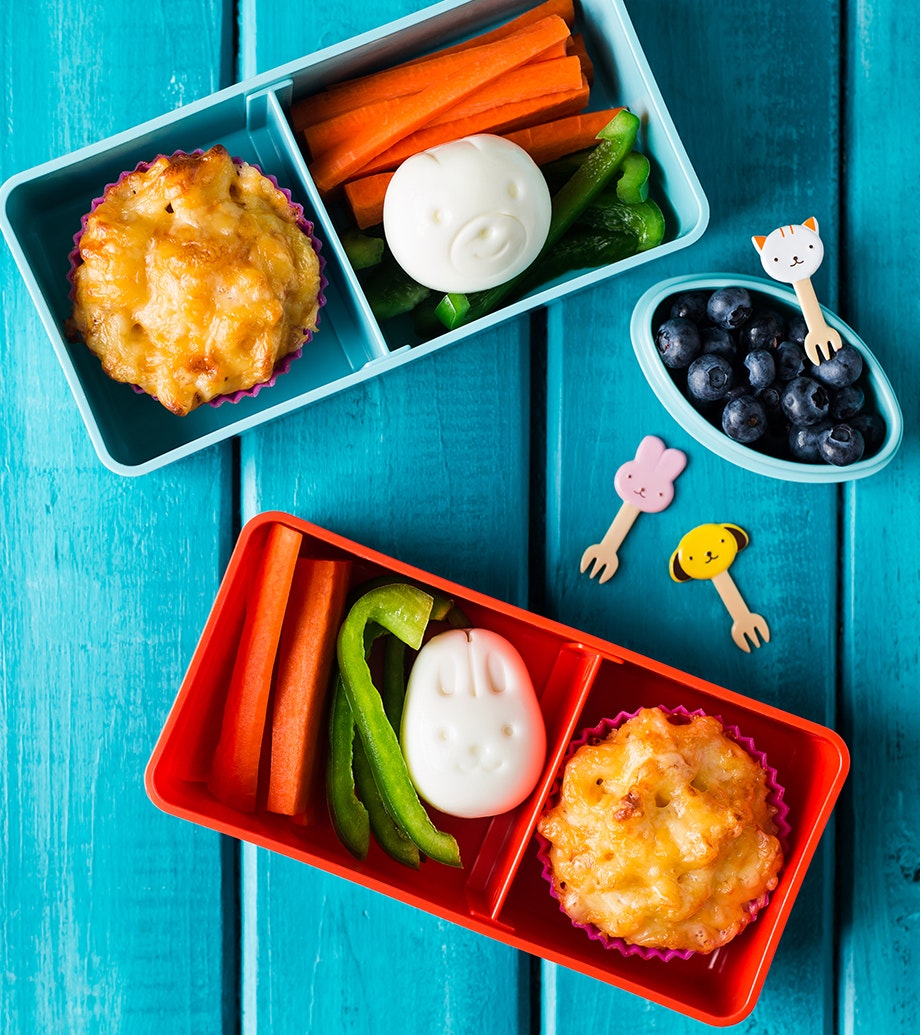 ● Pour un lunch amusant, servir les muffins de macaronis au fromage dans des boîtes à lunch style bento japonais avec un œuf dur (en forme d’animal!) et des crudités (bâtons de carotte, poivron, concombre, céleri).↲ ● Si vous n’avez pas de moules à muffins en silicone, vous pouvez utiliser des moules en papier sulfurisé (à ne pas confondre avec des moules en papier dans lesquels le macaroni au fromage collerait trop).